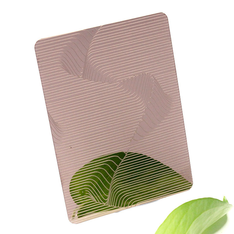 Etched finish is created by a screen printing the protective acid resistant to a polished surface and acid etching the unprotected areas.The etching removes a thin layer of stainless steel and roughens the surface.And etched stainless steel sheet is a type of decorative stainless steel that has undergone a chemical or mechanical process to create patterns, designs, or textures on its surface.The etching process selectively removes material from specific areas, resulting in a contrast between the etched and unetched regions.This creates intricate and precise designs that are both aesthetically pleasing and durable.